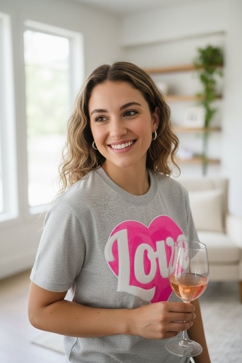 Spread love with this eye-catching graphic tee featuring a bold L.O.V.E. patch design in vibrant pink and crisp white. Perfect for making a statement, this comfortable everyday essential combines style with meaningful messaging. Whether you're dressing up a casual look or layering for extra warmth, this piece brings personality and positivity to your wardrobe. Available in multiple sizes to fit everyone in your crew.
