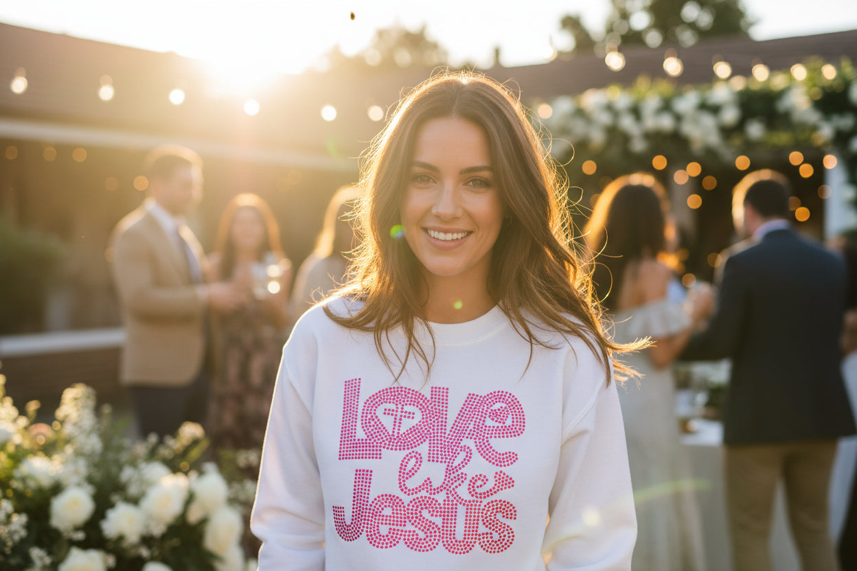 Love Like Jesus Pink Rhinestone Graphic Shirt Inspire faith and style with this eye-catching graphic tee featuring a shimmering pink rhinestone design. Perfect for expressing your spiritual values while turning heads, this shirt combines meaningful messaging with modern flair. The quality construction ensures comfort through all-day wear, whether you're heading to church, casual outings, or gatherings with friends. Available in multiple sizes, it's an ideal choice for anyone seeking apparel that reflects their beliefs. Make a statement that matters—wear your faith proudly.