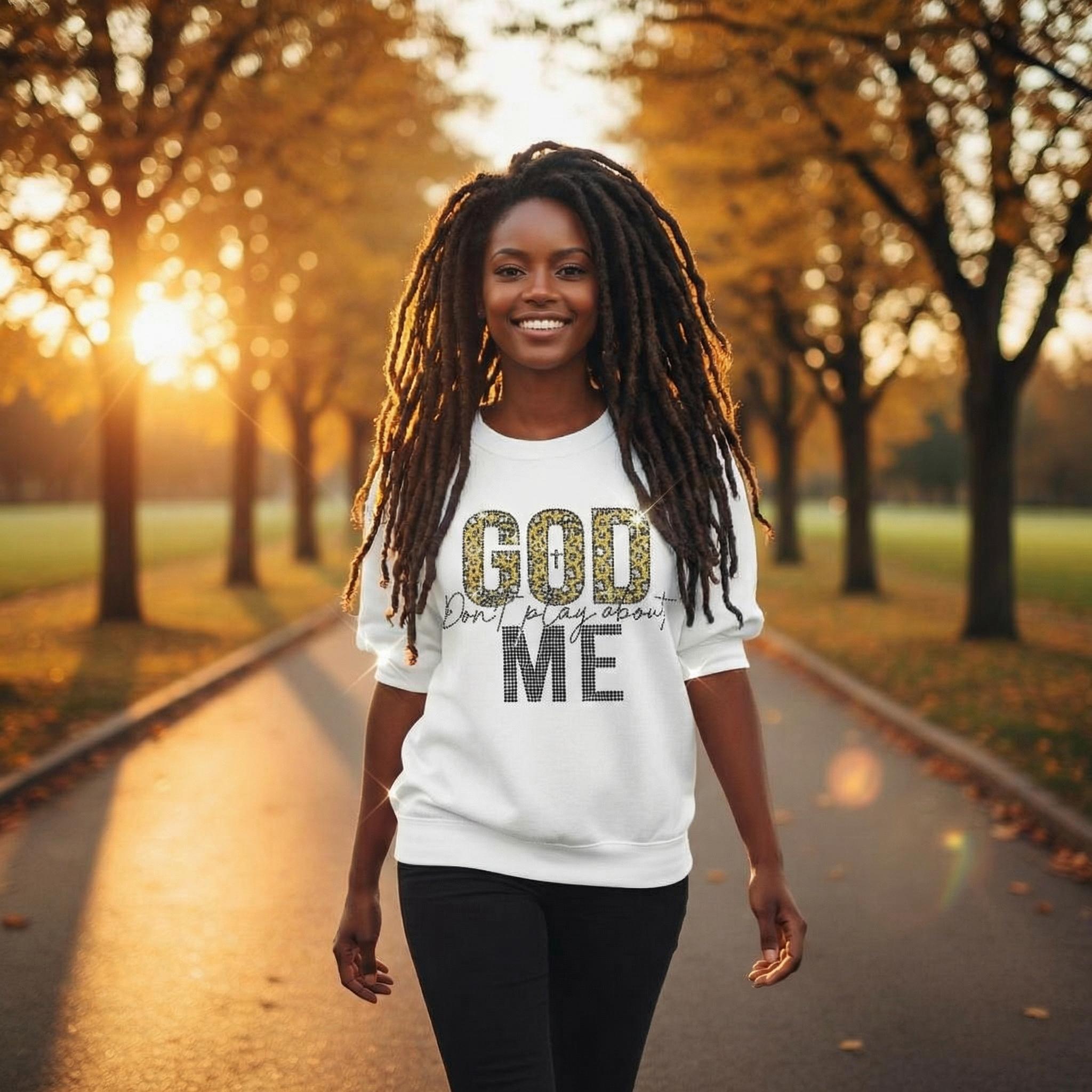 God Don't play about me rhinestone graphic shirt is more than just a piece of clothing; it’s a statement! This stylish shirt boasts a stunning rhinestone graphic that shimmers and shines, making you stand out in any crowd. With the phrase 'God Don't play about me" rhinestone graphic shirt' proudly displayed, it encourages confidence and self-expression. Therefore, wearing this shirt allows you to celebrate your unique beauty and empowers others to do the same. It’s not just a fashion statement; it’s a mindset!