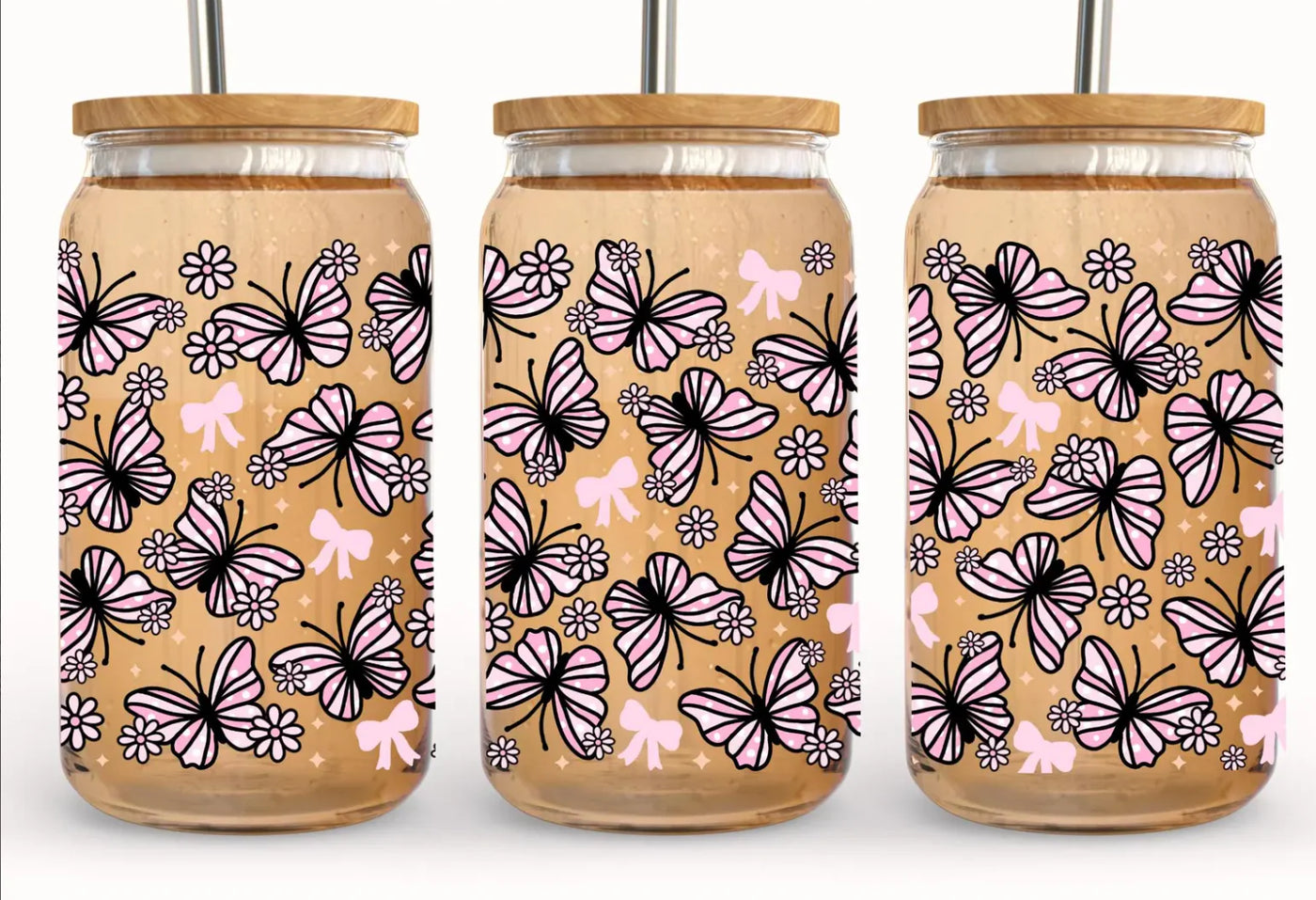 Pink Bows and Butterflies 16 oz Graphic tumbler - Glass