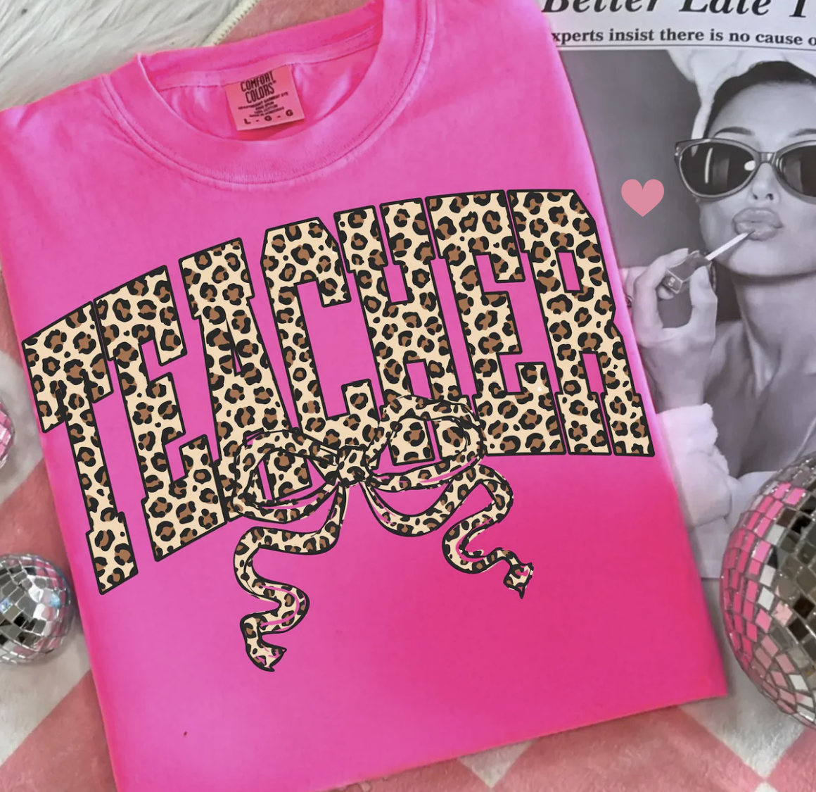 Teacher Leopard Print Glitter Infused Graphic Celebrate your passion for teaching with this eye-catching leopard print tee featuring shimmering glitter-infused graphics. The bold animal print design combined with sparkly accents creates a statement piece that's perfect for educators who want to showcase their personality in style. Whether you're in the classroom or out on the town, this comfortable graphic tee delivers confidence and flair. Available in multiple sizes, it's the ideal gift for any teacher who deserves to shine as brightly as their students.