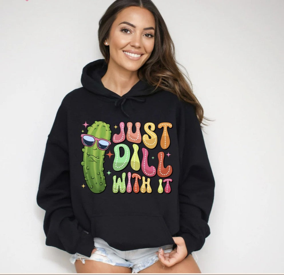 Our 'Just Dill with It' sweatshirt features a unique graphic that combines style with a playful twist. This trendy apparel is infused with glitter, making it eye-catching and perfect for both casual outings and comfy days at home. The vibrant design not only stands out but also allows you to express your personality, effortlessly adding flair to any outfit.