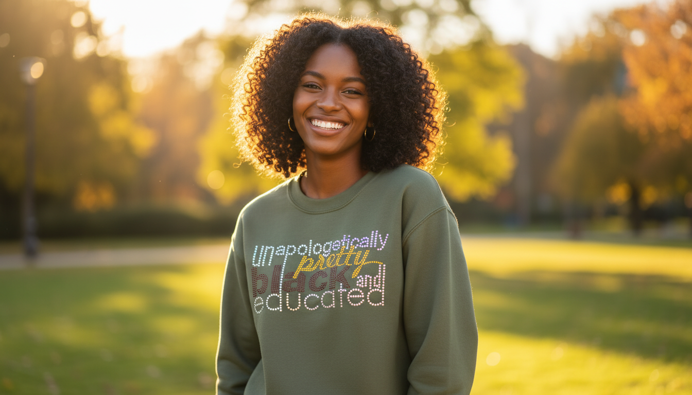 Celebrate your confidence and pride with this striking rhinestone graphic shirt. Featuring bold lettering that declares "Unapologetically Pretty Black and Educated," this shirt makes a powerful statement while delivering everyday comfort. The eye-catching rhinestone design catches the light beautifully, adding sparkle and dimension to your look. Perfect for anyone who embraces their identity with style and substance, this versatile piece pairs effortlessly with jeans, skirts, or joggers for a complete outfit that turns heads and sparks conversations.