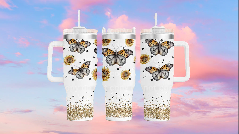 This 40 Oz tumbler "You give me Butterflies sublimated design" insulated tumbler provides superior temperature retention, keeping beverages cold for up to 12 hours and hot for up to 12 hours. The fashionable stainless steel construction adds a unique look to any outfit, making it a reliable and stylish companion. Hand wash recommended for best care.
